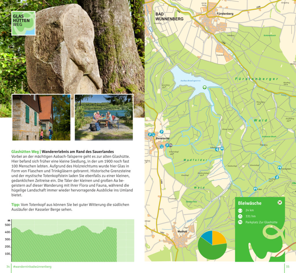 Vorbei an der mächtigen Aabach-Talsperre geht es zur alten Glashütte. Hier befand sich früher eine kleine Siedlung, in der um 1900 noch fast 100 Menschen lebten. Aufgrund des Holzreichtums wurde hier Glas in Form von Flaschen und Trinkgläsern gebrannt. Historische Grenzsteine und der mystische Totenkopfstein laden Sie ebenfalls zu einer kleinen, gedanklichen Zeitreise ein. Die Täler der kleinen und großen Aa begeistern auf dieser Wanderung mit ihrer Flora und Fauna, während die hügelige Landschaft immer wieder hervorragende Ausblicke ins Umland bietet.